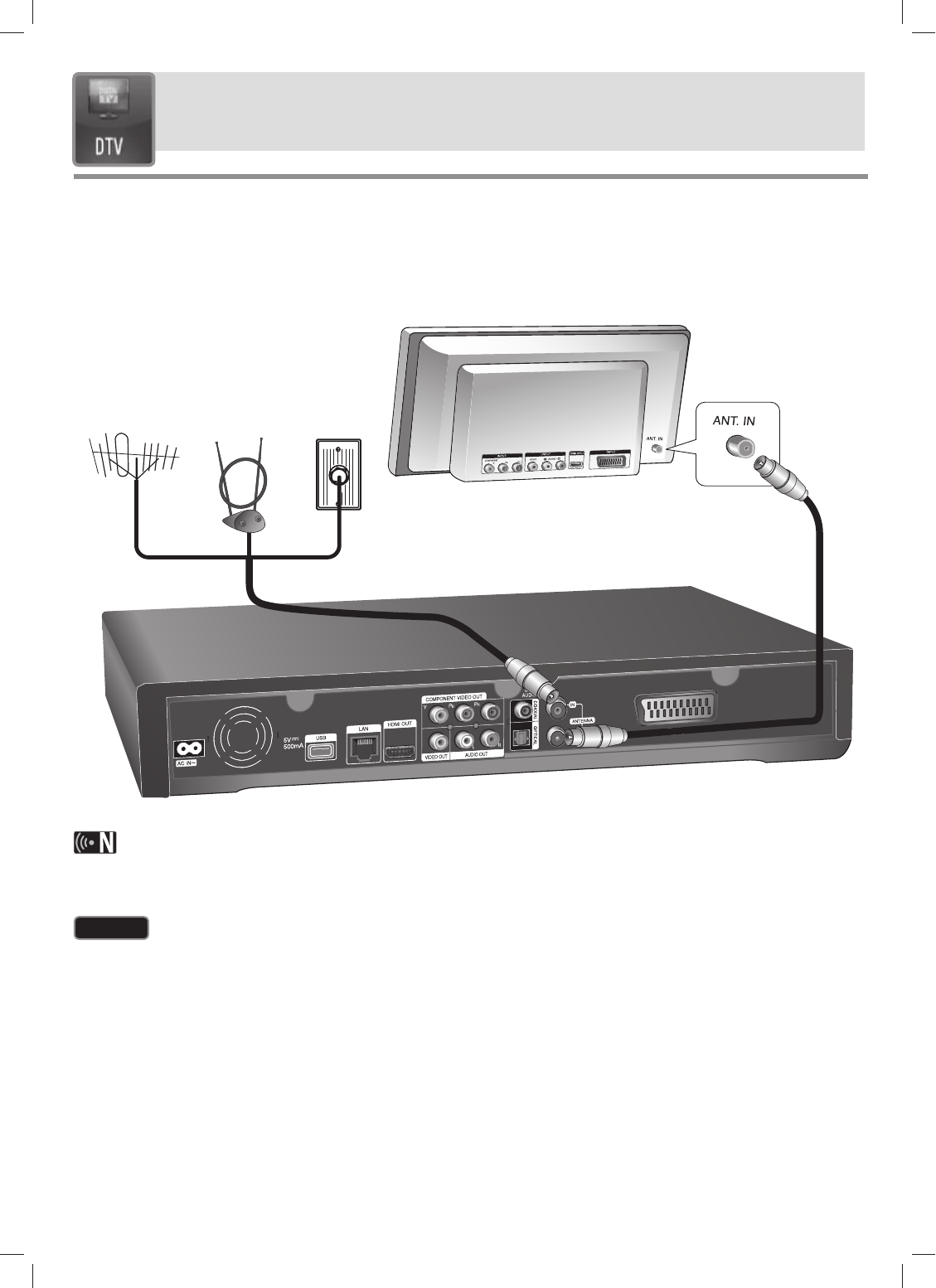 Connect the DTV antenna to the ANTENNA IN jack on the rear panel as described below.